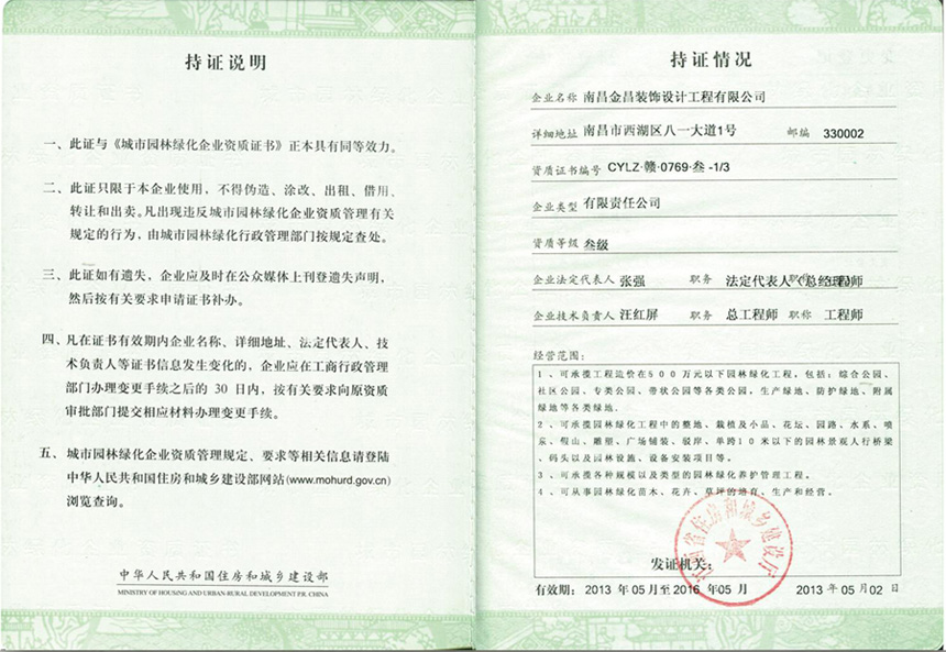 2013年5月,我公司順利取得城市園林綠化三級資質(zhì)??沙袛埞こ淘靸r500萬元以下園林綠化工程,包括綜合公園、社區(qū)公園、專類公園、帶狀公園等各類公園,生產(chǎn)綠地、防護(hù)綠地、附屬綠地等各類綠地。可承攬園林綠化工程中的整地、栽植及小品、花壇、園路、水系、噴泉、假山、雕塑、廣場鋪裝、駁岸、單跨10米以下的園林景觀人行橋梁、碼頭以及園林設(shè)施、設(shè)備安裝項目等。可承攬各種規(guī)模以及類型的園林綠化養(yǎng)護(hù)管理工程??蓮氖聢@林綠化苗木、花卉、草坪的培育、生產(chǎn)和經(jīng)營。