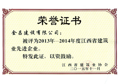 江西省建筑業(yè)協(xié)會(huì)于2015年10月14日召開(kāi)了全省建筑業(yè)先進(jìn)企業(yè)評(píng)審委員會(huì)會(huì)議,根據(jù)《江西省建筑業(yè)先進(jìn)企業(yè)評(píng)選辦法》(贛建協(xié)字[2015]7號(hào)),經(jīng)評(píng)審委員會(huì)審定,金昌建設(shè)有限公司被評(píng)為2013-2014年度江西省建筑業(yè)先進(jìn)企業(yè)。